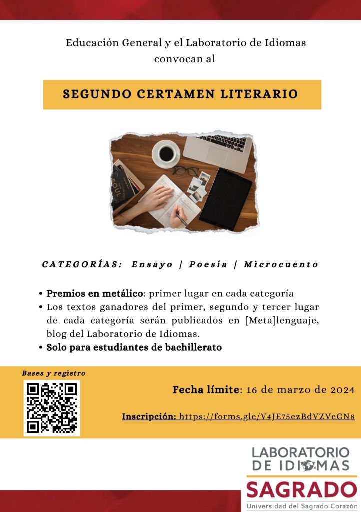 - Antes de enviar su participación, los concursantes deben revisar sus textos con el Laboratorio de Idiomas mediante consultas. No se aceptarán participaciones que no cumplan con este requisito. Las consultas con el Laboratorio de Idiomas se trabajan a través de citas programadas en Symplicity: https://sagrado-csm.symplicity.com/