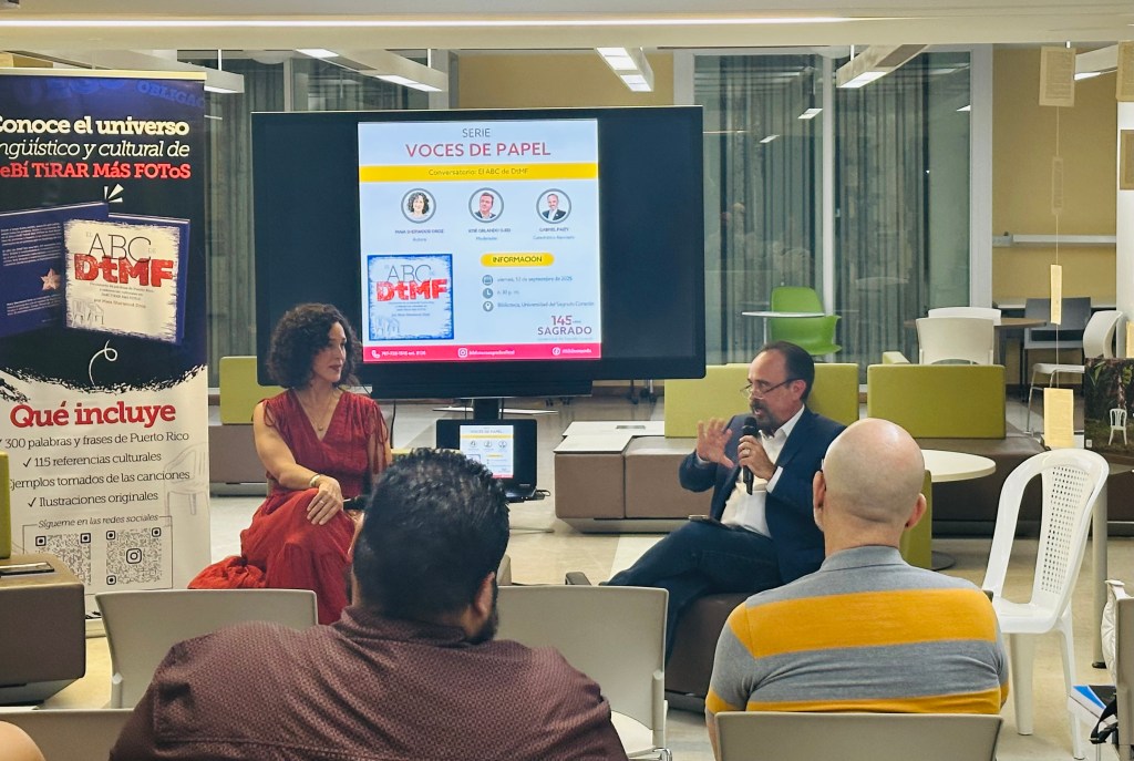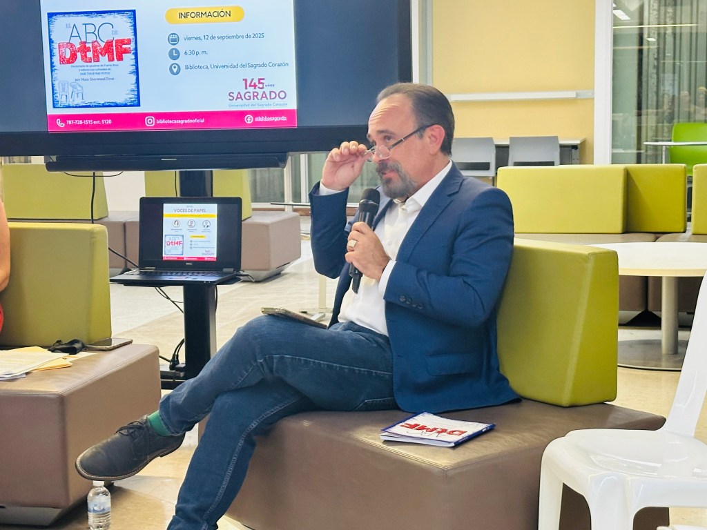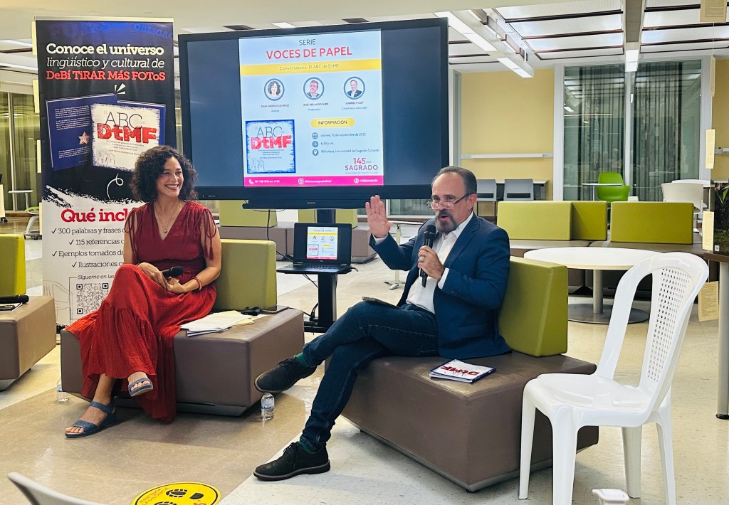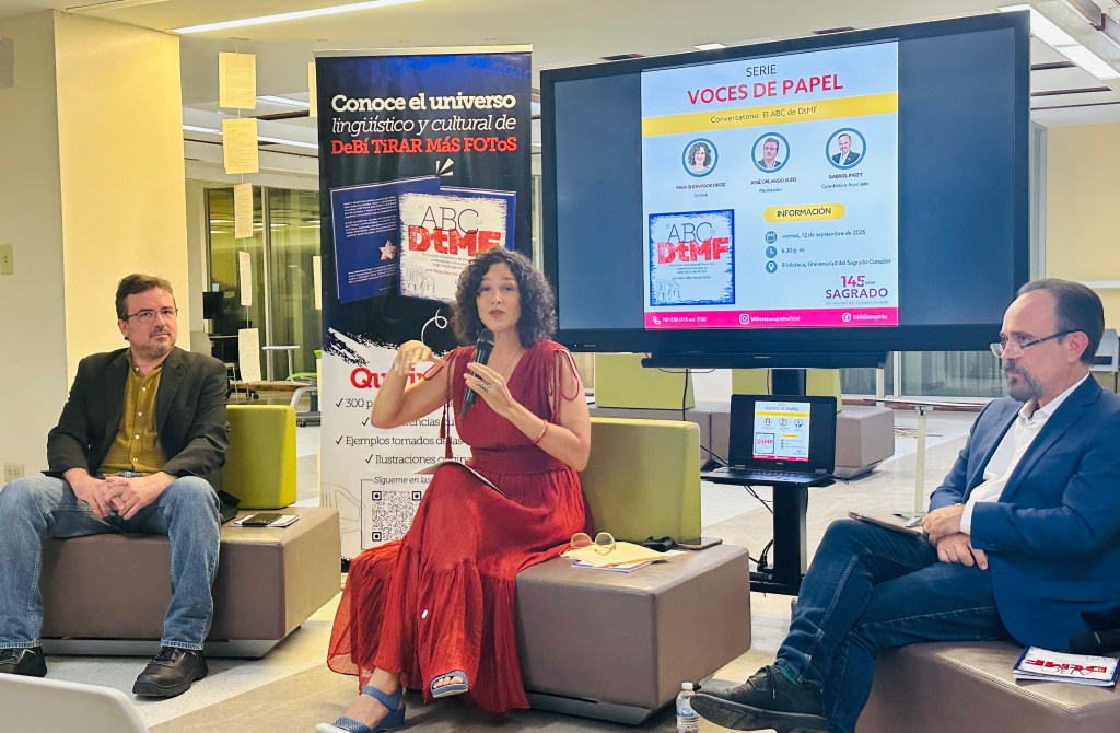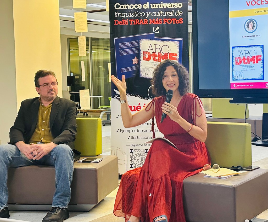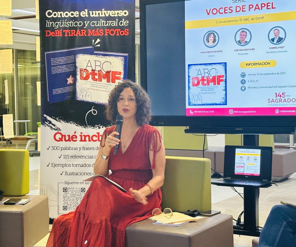 El pasado viernes, 12 de septiembre de 2025, la Biblioteca Madre María Teresa Guevara, en colaboración con el Centro de Idiomas, celebró un nuevo evento de su serie Voces de papel con la presentación del libro El ABC de DtMF: Diccionario de palabras de Puerto Rico y referencias culturales en DeBÍ TiRAR MáS FOToS, de la lexicógrafa puertorriqueña Maia Sherwood Droz.